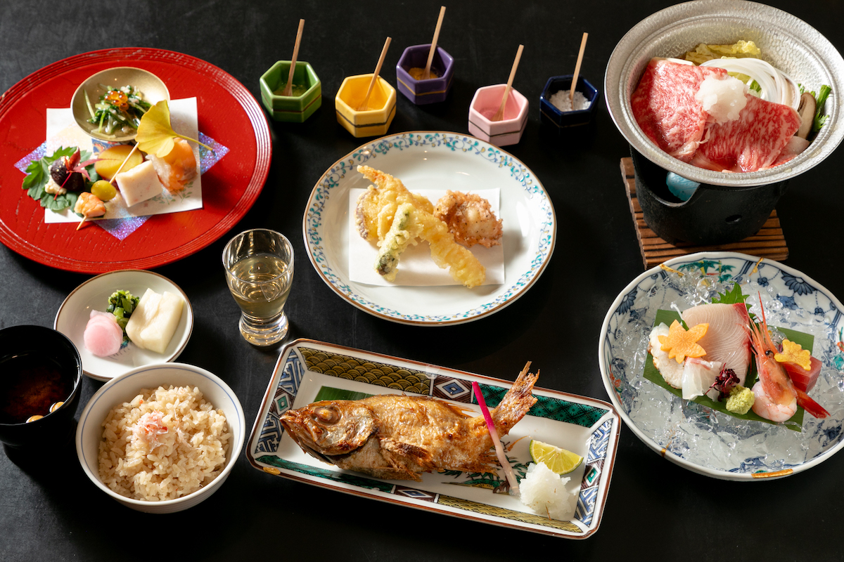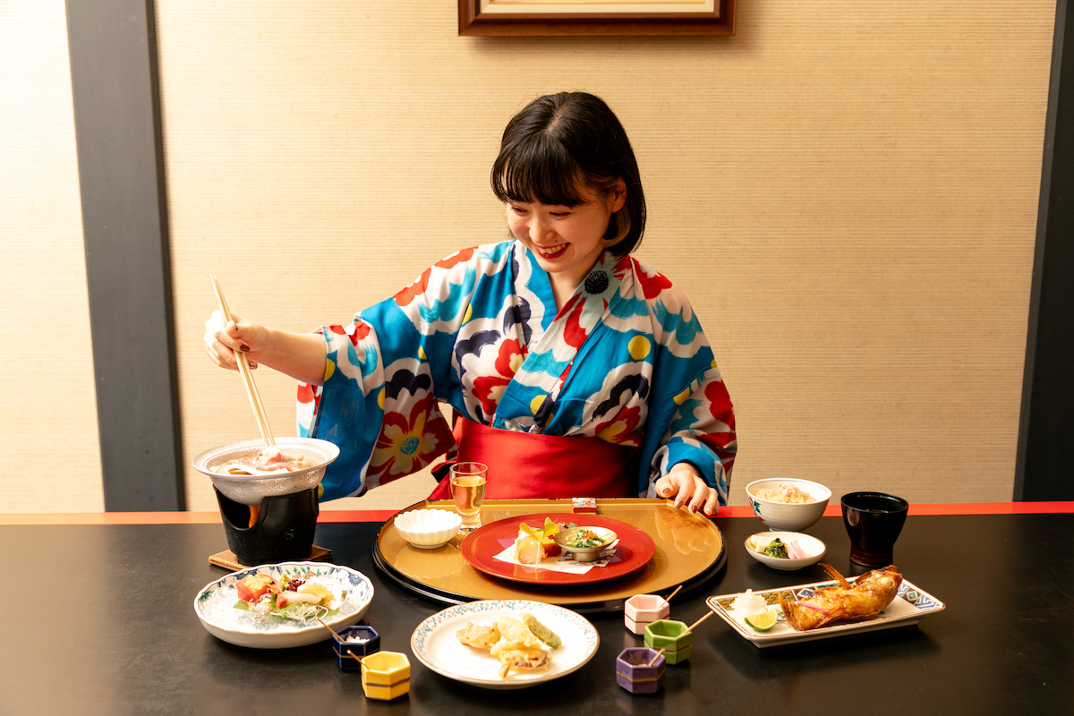 1日目にして浴衣、パンケーキ、貸切風呂、グループ旅館への湯めぐりときて、さらに客室にもおもてなしを感じられ、至福な時間を満喫。そして旅館といえば非日常な夕食!「吉祥やまなか」はそんな期待にこたえる豪華な夕食が提供されます。