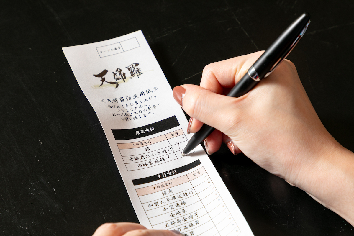 しかも驚きはまだ続きます。追加料金950円で天婦羅のおかわりが自由に! そんなことある?と衝撃を受けました。写真の用紙に追加したい天婦羅の点数を記入してスタッフの方に渡すだけ。