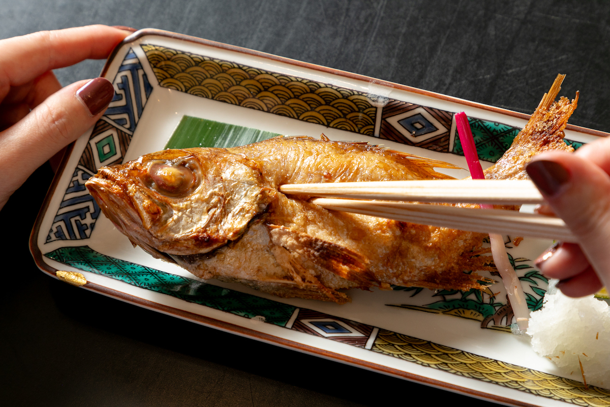 日本海沿いにある石川県といえば、ノドグロなど新鮮な魚をイメージする方が多いのではないでしょうか。「姿のどぐろ 珠洲の塩焼き」はイメージ通りの脂がのった新鮮なノドグロをいただきます。高級魚なので地元の方でも食べる機会が多くはないとのこと。そんなノドグロが食べられるなんて、最高!