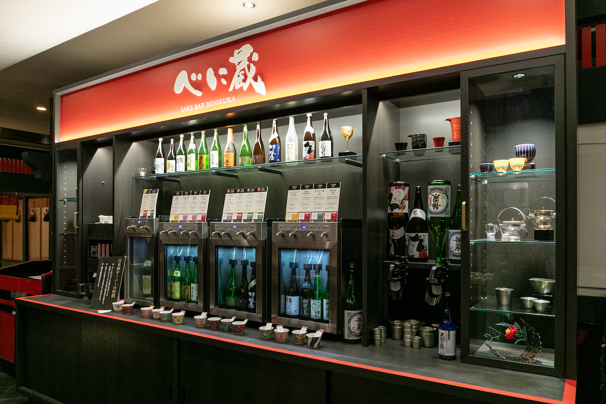 そしてこの加賀料理「べにはな」内に、北陸を中心に厳選した地酒が一堂に会する地酒処「SAKE BAR べに蔵」が設置されています。日本酒サーバーで開封後の風味を逃がさずに日本酒本来の味を楽しめて、さらに伝統工芸「九谷焼」、「山中塗」、「能登錫」、「能登島ガラス」の酒器もあって、まさに「北陸の酒」を飲んでいるといった実感がわくはず。
