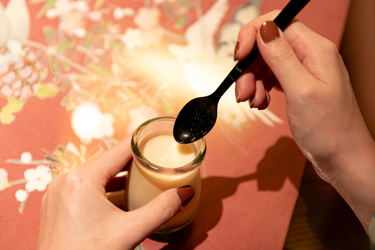 「山中節の夕べ」も見られてこれで以上かと思っていたら、なんとまだおもてなしが! 1階ロビーラウンジにて20時から22時の間限定で「KAGAプリン」をいただけるんです。お休み前にデザートがあるなんて、至れり尽くせりです。