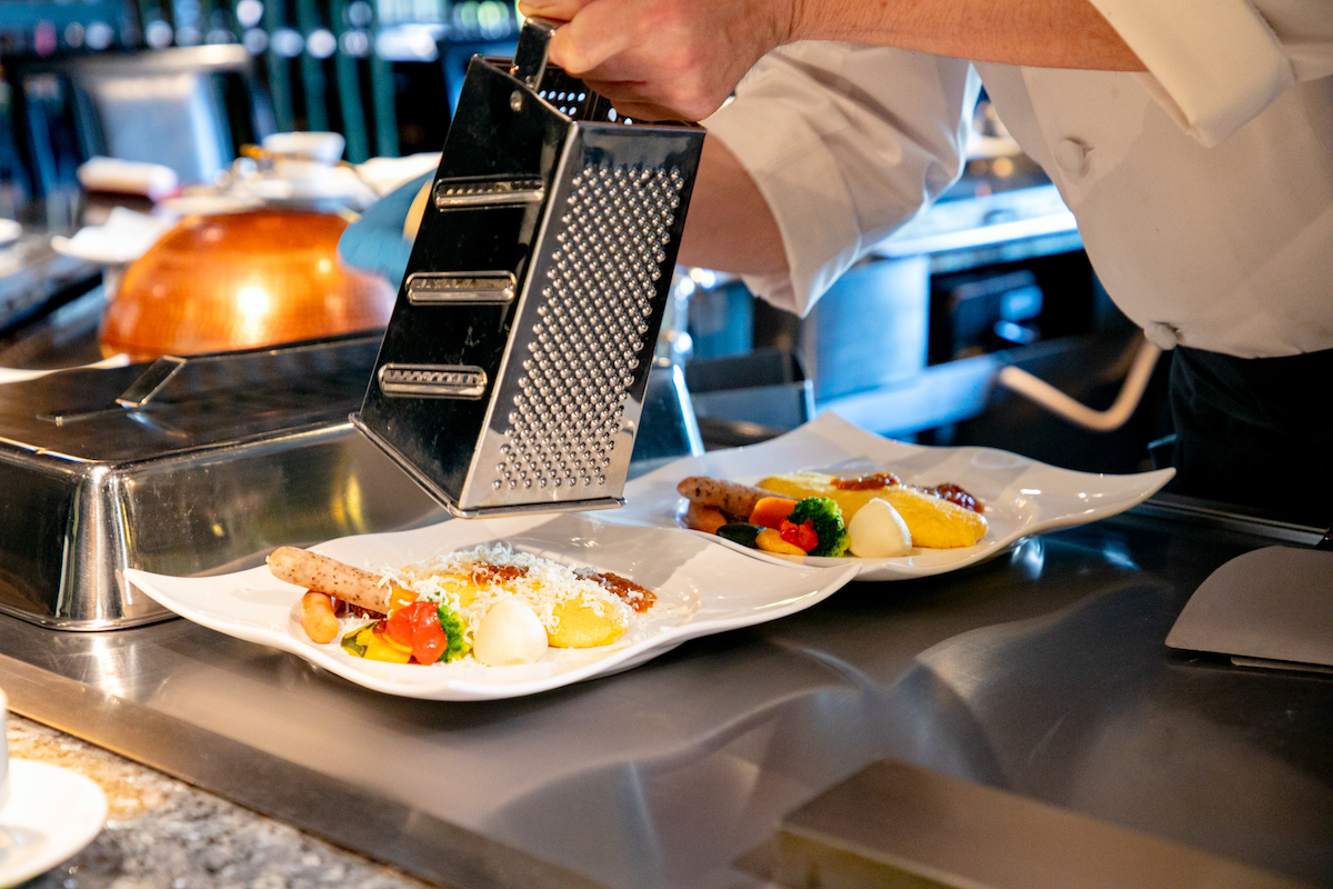 オムレツができたら仕上げにチーズを削ってまんべんなくかけるシェフ。はやく食べたいと心が躍る瞬間です。