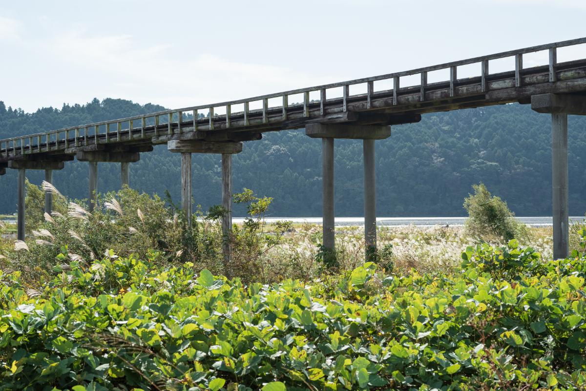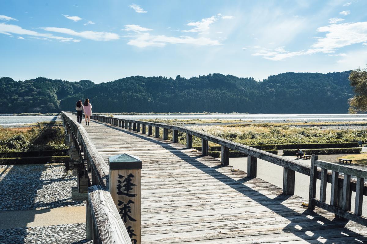 蓬莱橋は、静岡県島田市にある全長897.4m、通行幅2.4mの木造歩道橋。江戸時代、大井川は東海道最大の難所と言われ、川越人足が旅人を渡していましたが、明治時代に入ってから大井川右岸にある有名な茶産地・牧之原台地を開墾するためにこの橋が架けられました。
