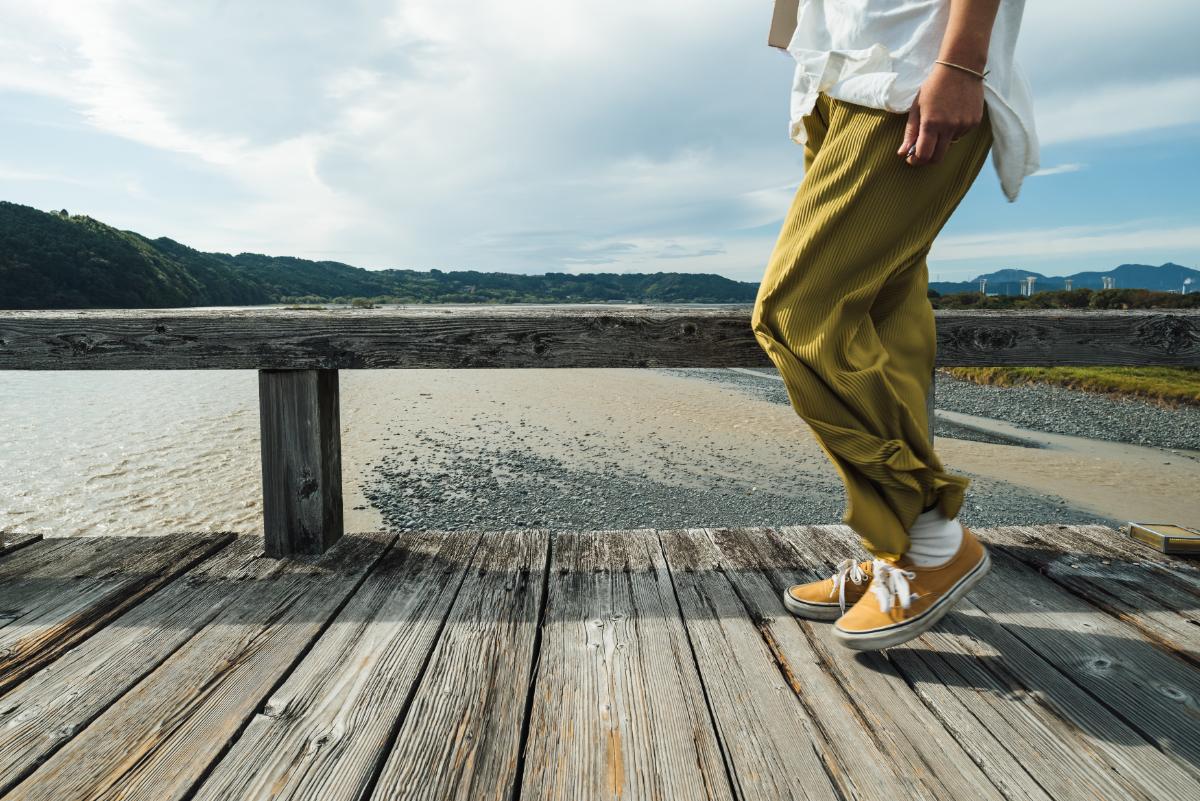 静岡県中部を流れ、旧東海道では随一の難所と詠われた大井川。蓬莱橋(ほうらいばし)は、そんな大井川の中流に架けられた、素朴ながらあることで世界一に認定されている木の橋です。橋のたもとの茶屋でお茶を飲みながら昔ながらの橋景色を眺め、のんびりとした時間を過ごしてみませんか。