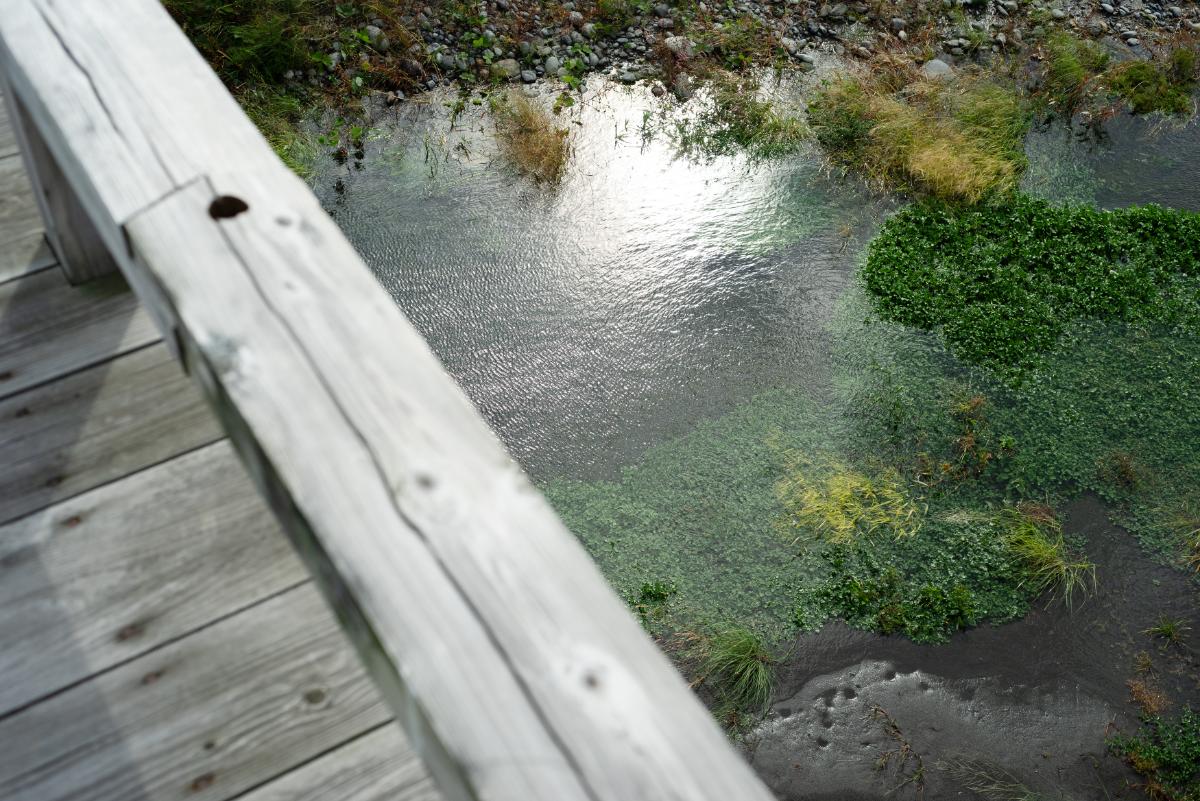 橋の表面には無垢の木がそのまま使われているので、その質感を間近に見ることができます。歩くたびに軋む音も新鮮。眼下には大井川がとうとうと流れていて、なかなか迫力があります。強風が吹いていることも多いので、落ちないようにご注意を。