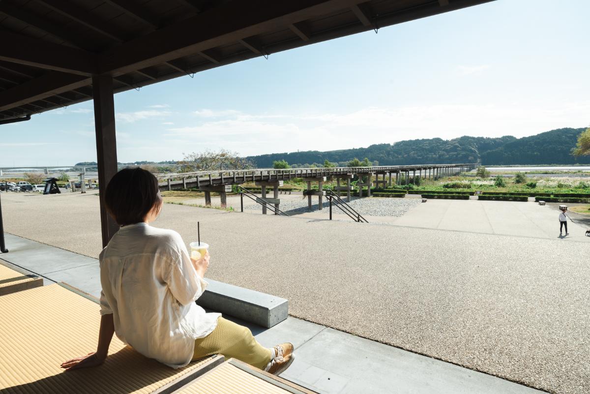 入口の横には畳席があり、そこに座って橋を眺めるのもいい時間です。お茶を飲みながら古い木の橋を眺めていると、昔の旅人になったような気分に。