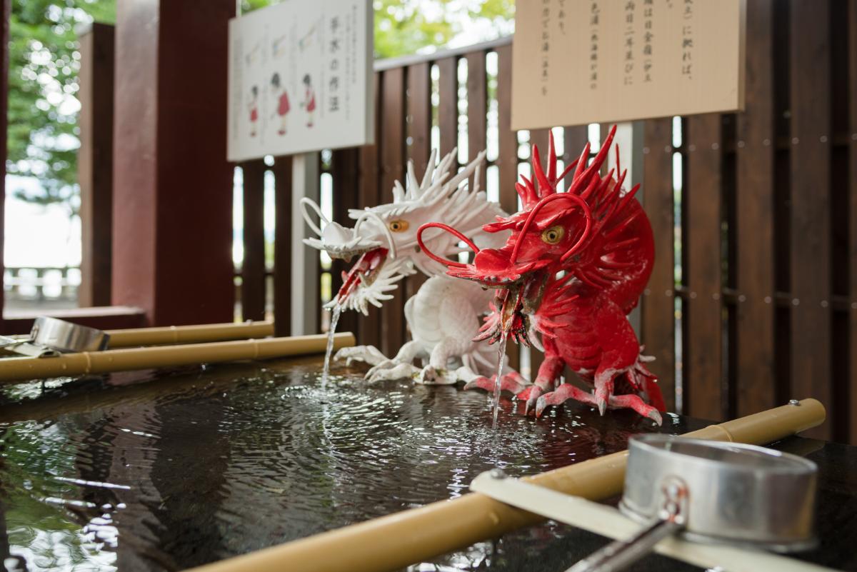 まず初めに、伊豆山神社のシンボルといえる「赤白二龍」が鎮座する手水舎に向かいましょう。赤い龍は火を、白い龍は水をつかさどり、2つの力を合わせて温泉を生み出す、最強の守護神です。