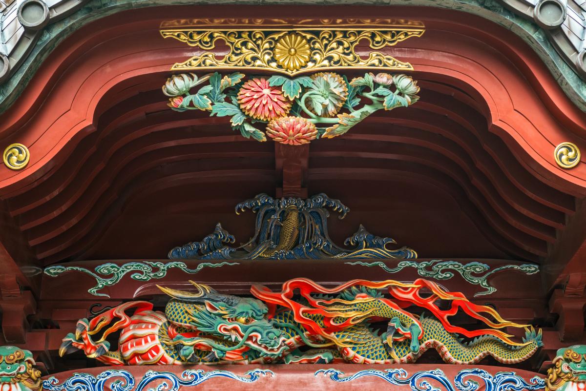 拝殿の彫刻は、「波を掘ったら日本一」と称された江戸時代の宮彫師、武志伊八郎信由(たけしいはちろうのぶよし)によるもの。職人によって生み出された、鮮やかで美しい造形をじっくり眺めてみてくださいね。