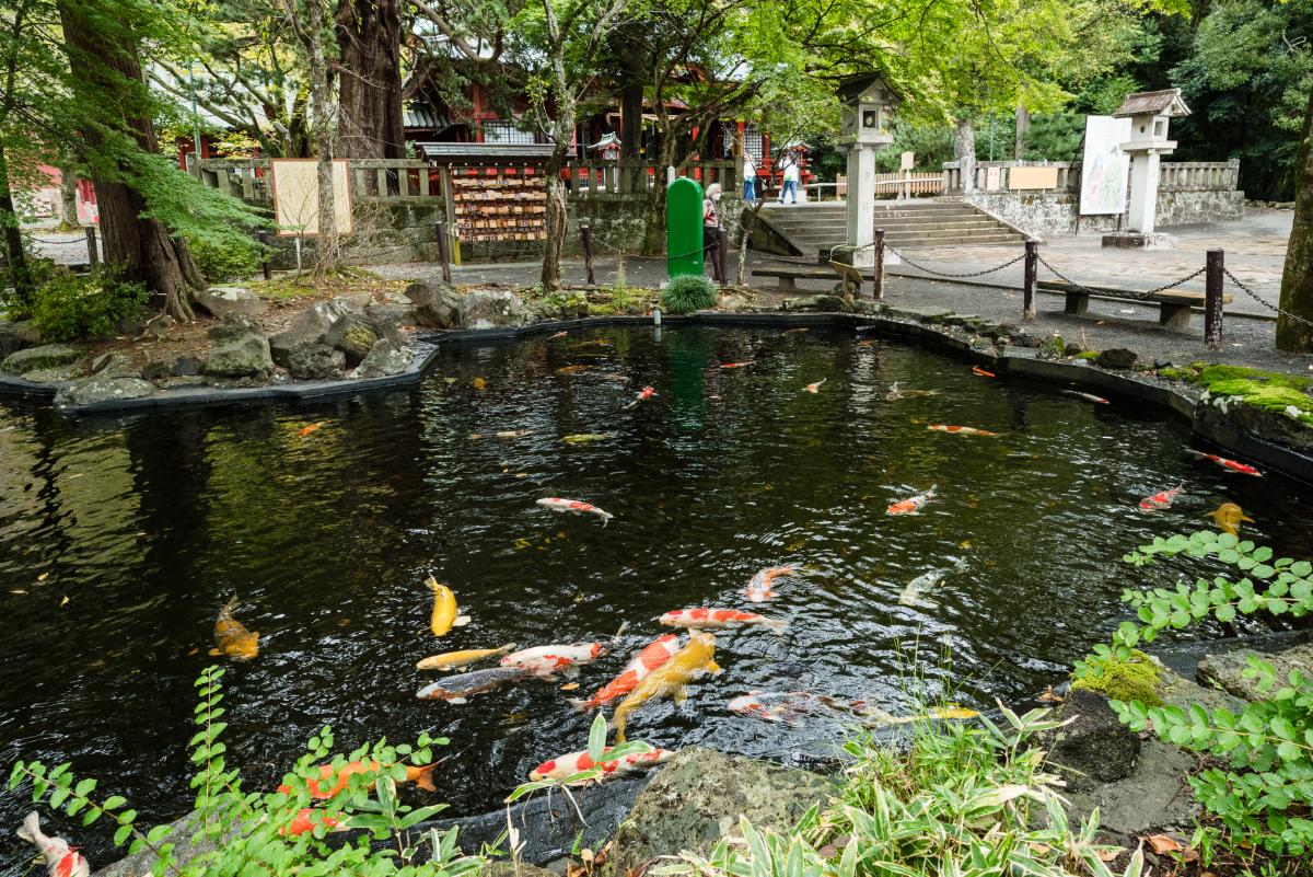本殿すぐ近くの龍神池には、立派な錦鯉が悠々と泳ぐ姿も。