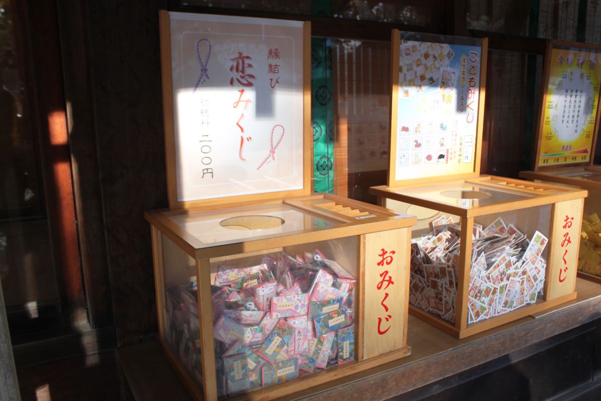 おみくじはスタンダードなもの以外に、恋みくじや縁起物が入った幸福みくじなども。英語や台湾語もあり、世界各国から参拝者が訪れる神社であることが感じられます。