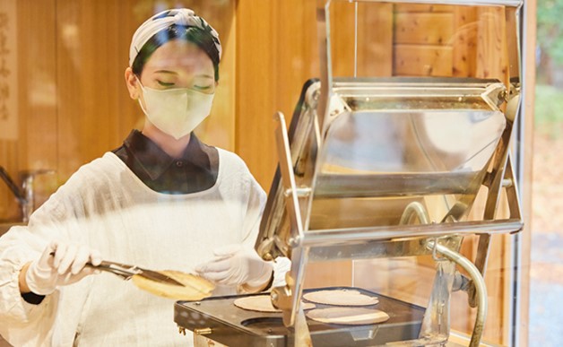 そしてもう一軒、北海道を代表する菓子メーカー六花亭の「神宮茶屋店」も境内に。ここでは六花亭の代表的なお菓子各種を販売するほか、神宮茶屋店限定の「判官さま」が不動の人気を集めます。おみやげ用に購入することもできるほか、店内の鉄板でこんがり、アツアツに焼いたものをその場でいただくこともできるんです。
