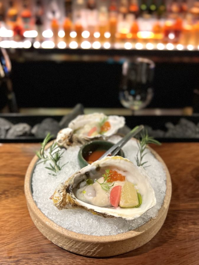4ピースで36000ウォンとお高めですが、手のひらほど大きい新鮮な生ガキの上に、イクラ、レモン、金粉がのり、お酢味の強いコチュジャンベースのタレでいただきます。