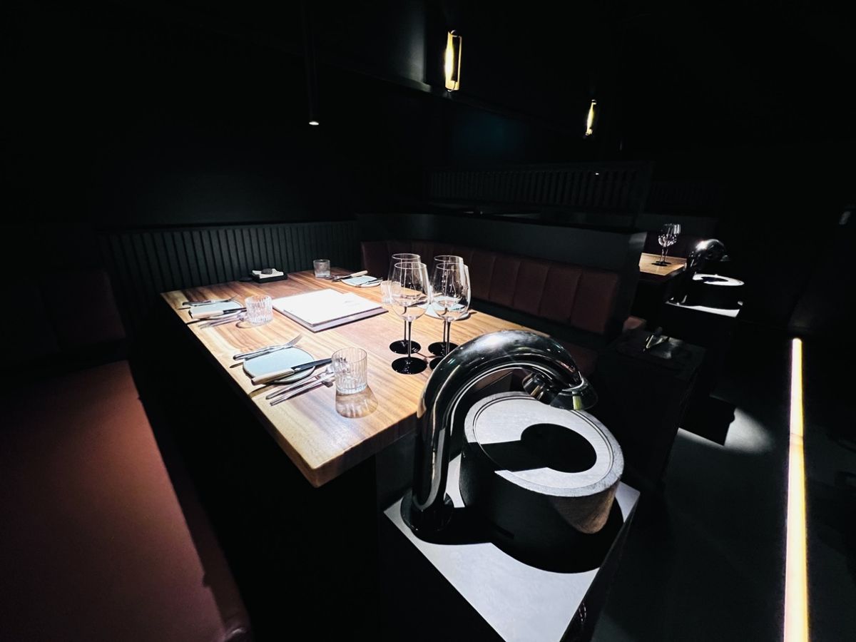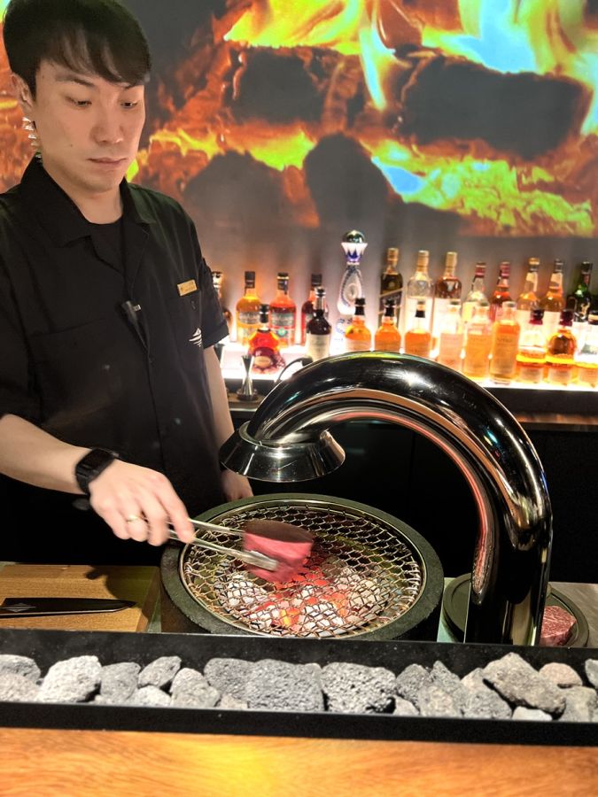 お店に入っていくと、モダンな大人の雰囲気。入ってすぐ目に入るのがカウンターで、思わずホテルのバーのようでどこでお肉を焼くの?と思ってしまうほど。バーカウンターに座ると、すぐ目の前に、専用の焼肉炭火があり、食事のぺースに合わせて担当スタッフが焼いてくれるスタイルになっています。店員さんが詳しくメニューを説明してくれ、食の好みや、今日の気分にあった料理を提案してくれます。どうやら韓国流の「オマカセ」はコースで決まったメニューを提供されるわけではなく、一品ごとにオーダーする方式のようです。