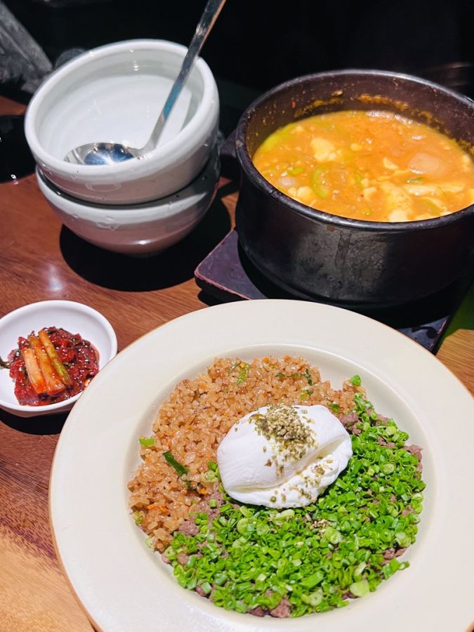 お肉メインの店ですが、最後の〆の食事として堪能してほしいメニューがあります。「テンジャンスンドゥブチゲ」13000ウォンと「「1++」韓牛そぼろポックンパッ」13000ウォン。テンジャンチゲは見た目よりも濃すぎず上品でまろやかな味で、軟らかいスンドゥブとよくあい、また、「「1++」韓牛そぼろポックンパッ」は、炒めご飯に韓牛のそぼろとネギがたっぷりとトッピングされ、ポーチドエッグを優しく崩してからいただくと、甘味たっぷりの韓牛と卵、炒めご飯の最高に調和がとれたおいしさを堪能できます。お肉でお腹いっぱいでもぜひ味わってほしい!!と思えるほど、こちらのお店の隠れ人気メニューなんだとか。