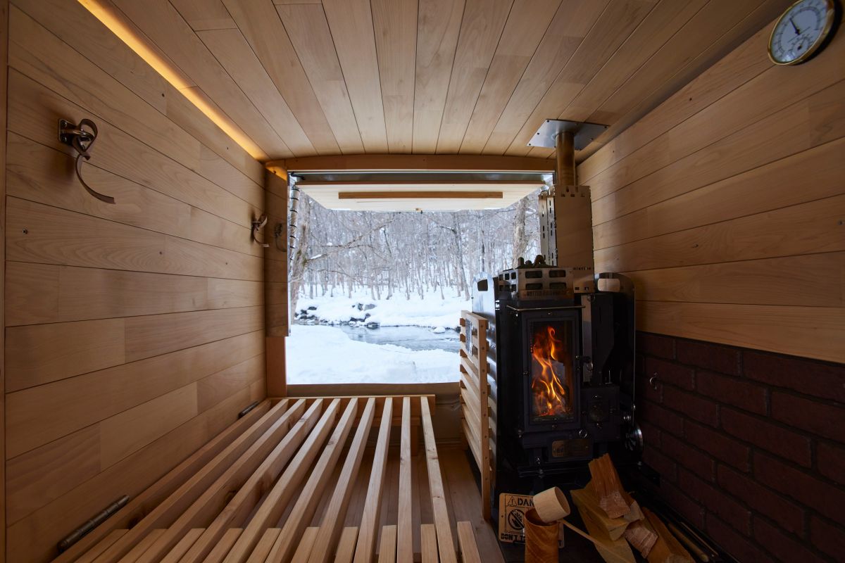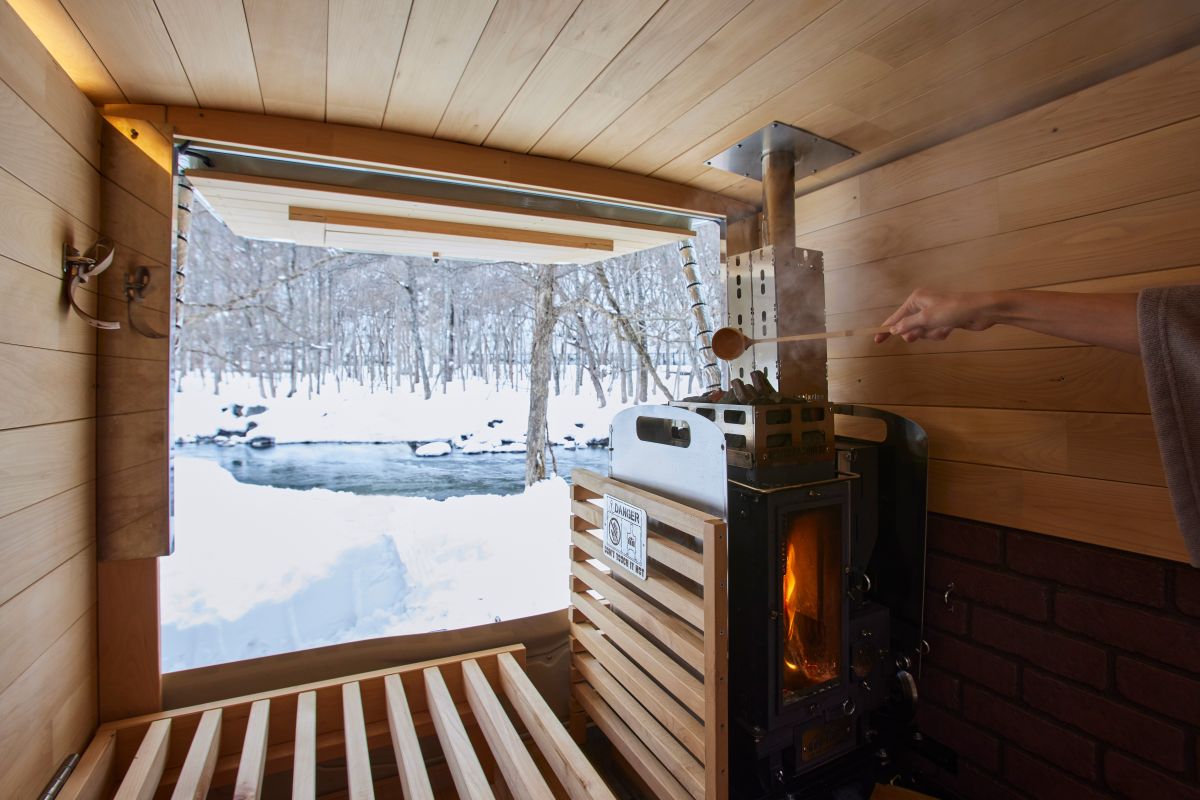 サウナの外に広がるのは、雪化粧した⽊々やしぶきを上げる川の流れなど、冬ならではの美しく幻想的な景⾊。セルフロウリュを楽しめ、貸切なので⾃分の好みに合わせて温度と湿度を調整も可能です。