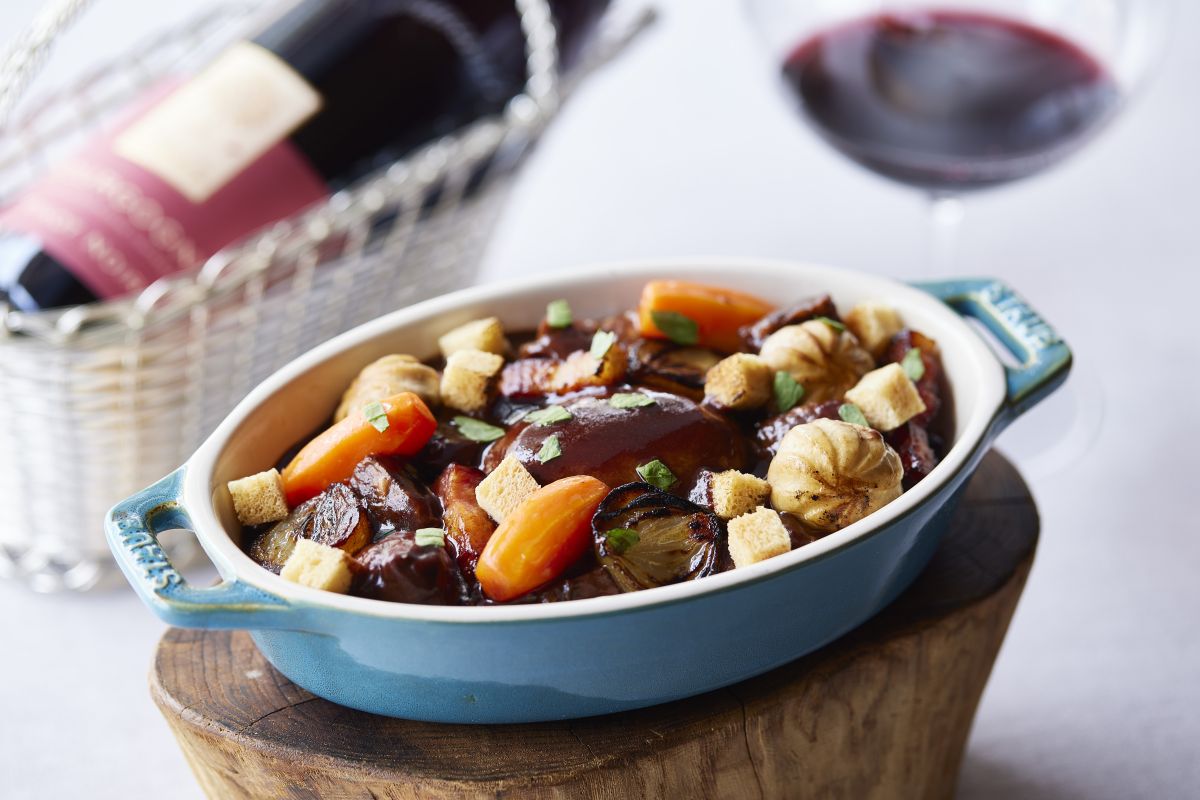 用意されるのはホテルのソムリエ厳選の⾚ワインを使⽤した、フランスの煮込み料理「ブフ・ブルギニョン」。濃厚な⾚ワインと野菜の味わいが、ととのった体にじんわり染みわたります。
