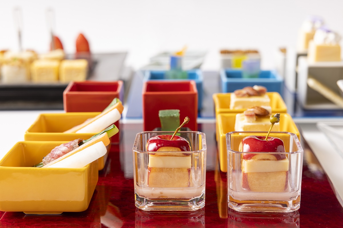 レッドのプレートには、バター香るリンゴのコンポートや、ベーコンとメープルの味わいがマッチしたチーズ豆腐などが並びます。