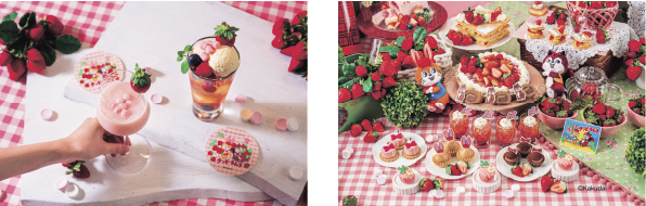 「クッピーラムネ」のデザインとなっているウサギの「クッピー」とリスの「ラム」をモチーフにしたタルトレットやロールケーキなど、「クッピーラムネ」のさわやかさとイチゴの甘酸っぱさを見事にかけ合わせたスイーツが登場。ちょっとレトロでかわいい「クッピーラムネ」の世界観に合うよう、少しかためのプリンやナポリタンなど昔ながらのスイーツや軽食も心ゆくまで満喫できます。