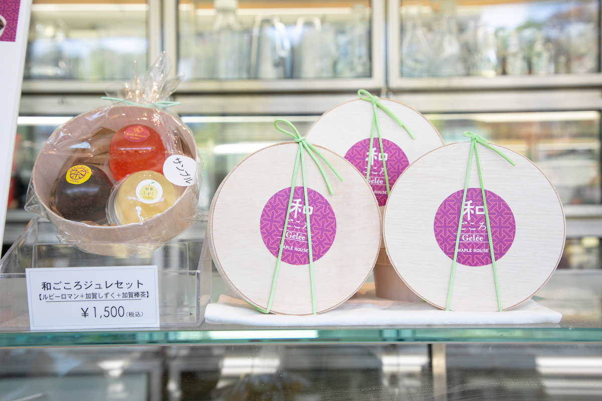 さらにケーキのショーケース付近にはおみやげ向きの商品も数種類おいてあります。2023年10月の取材時点では定番の「和ごごろジュレセット」1500円や、季節限定の「まるごといちじくロール」2300円などが置いてありました。食事の後、帰る前に見てみてくださいね。