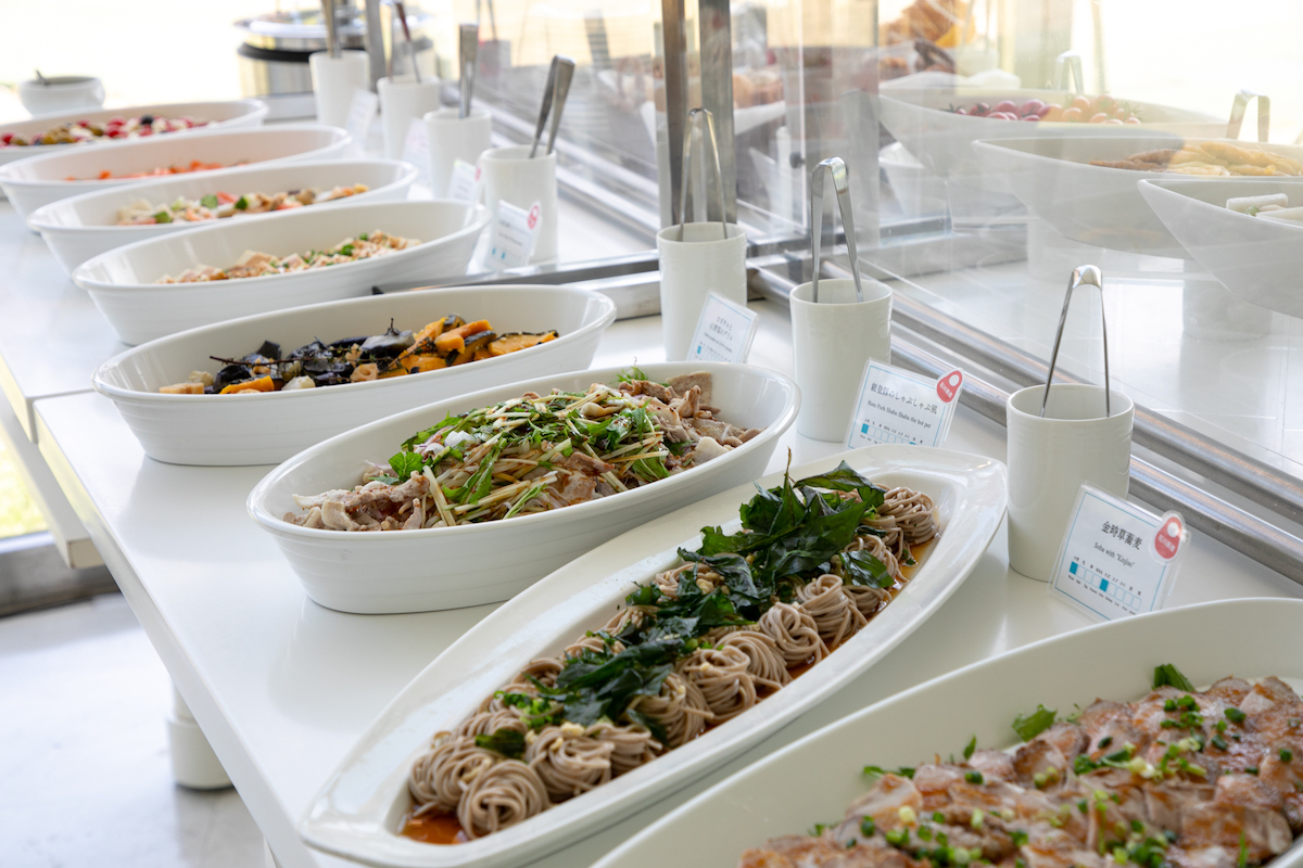 今回は定番の「フュージョンランチ」をいただきます。まずは店内にある前菜ビュッフェコーナーに行って好きなものをお皿にのせます。2023年10月の取材日は、石川県産の五郎島金時の大学芋、野菜のピクルス、金時草蕎麦、能登豚のしゃぶしゃぶ風、シーフードマリネなどがありました。石川県産のものは特に「石川県産」とわかりやすく表示されているので、何をのせようか悩んだら特に選ぶべき一品です。