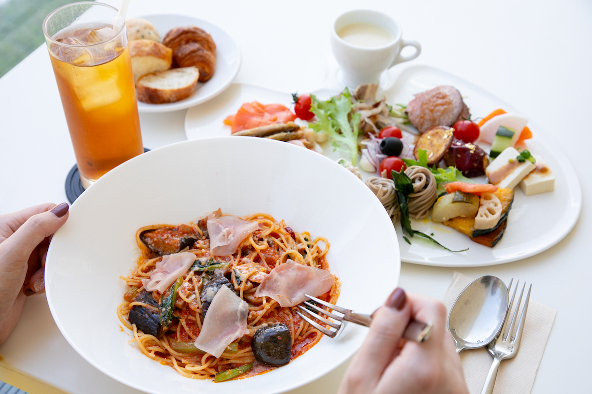そしてメイン料理は日替わりのパスタとライスプレートのどちらか選べますが、取材した日は「ツナとキノコのオイルソースパスタ」、「生ハムとナスのトマトソースパスタ」、「能登牛コロッケカレー」でした。今回は「生ハムとナスのトマトソースパスタ」をチョイス。