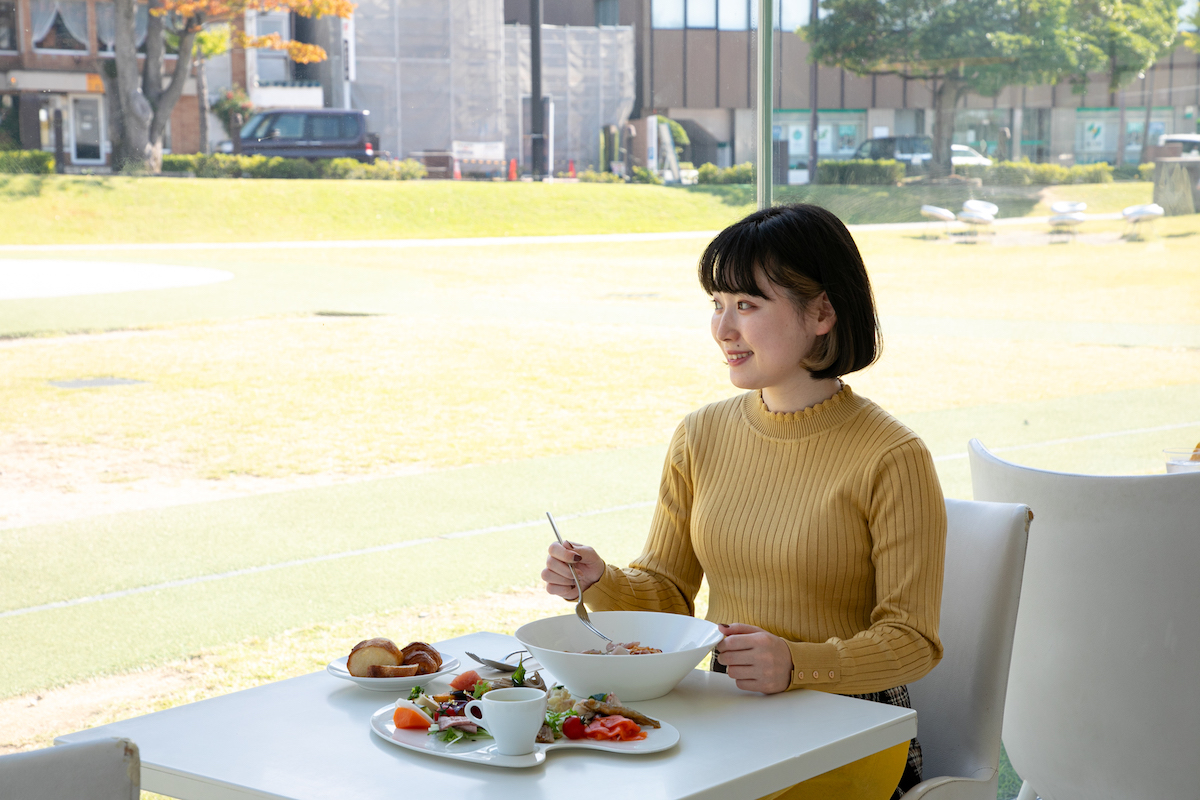 特徴は、旬の地産食材をふんだんに使ったランチやスイーツが食べられること。また、外壁がガラス張りのため、金沢21世紀美術館の『カラー・アクティヴィティ・ハウス』という作品や芝生広場を眺めながら過ごせることもポイントです。