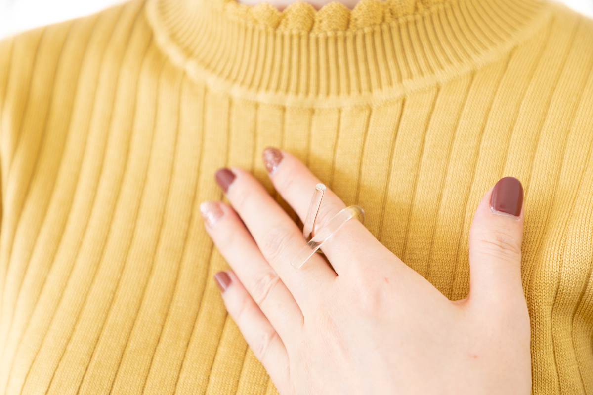 リングを試してみました。透明なので身に着けたほうがその良さが分かりますね!リング以外のアクセサリーもあり、気になった方は試すこともできるので、スタッフの方に確認してみてくださいね。