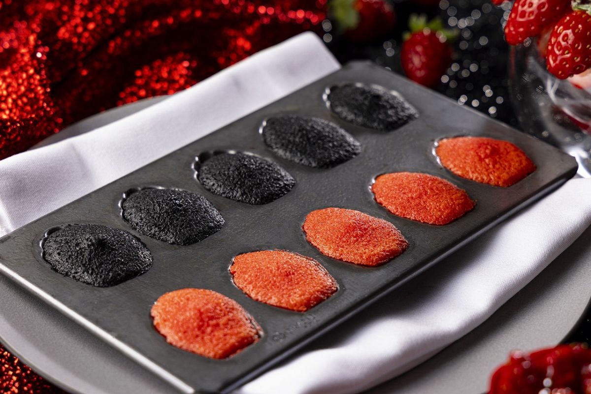 北海道産バターと竹炭を使用した2種のイチゴ味の焼きたてミニマドレーヌ10個は、マスカルポーネと生クリームを合わせたクリームや甘酸っぱいイチゴの自家製ジャムを付けて、温かいうちに召し上がれ。