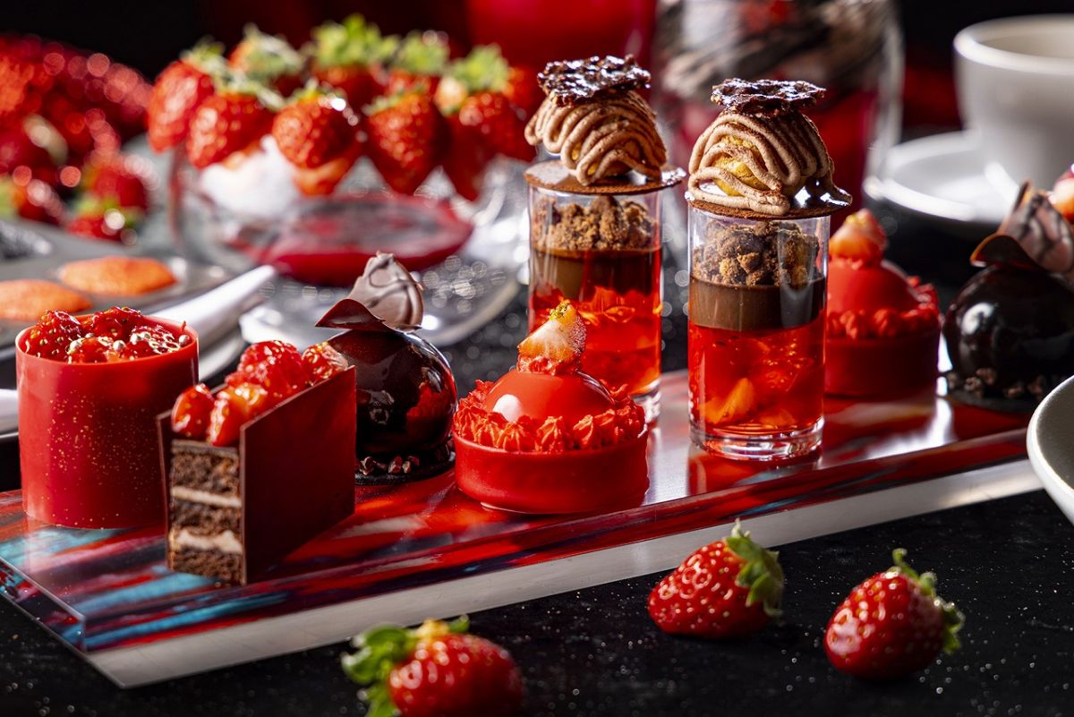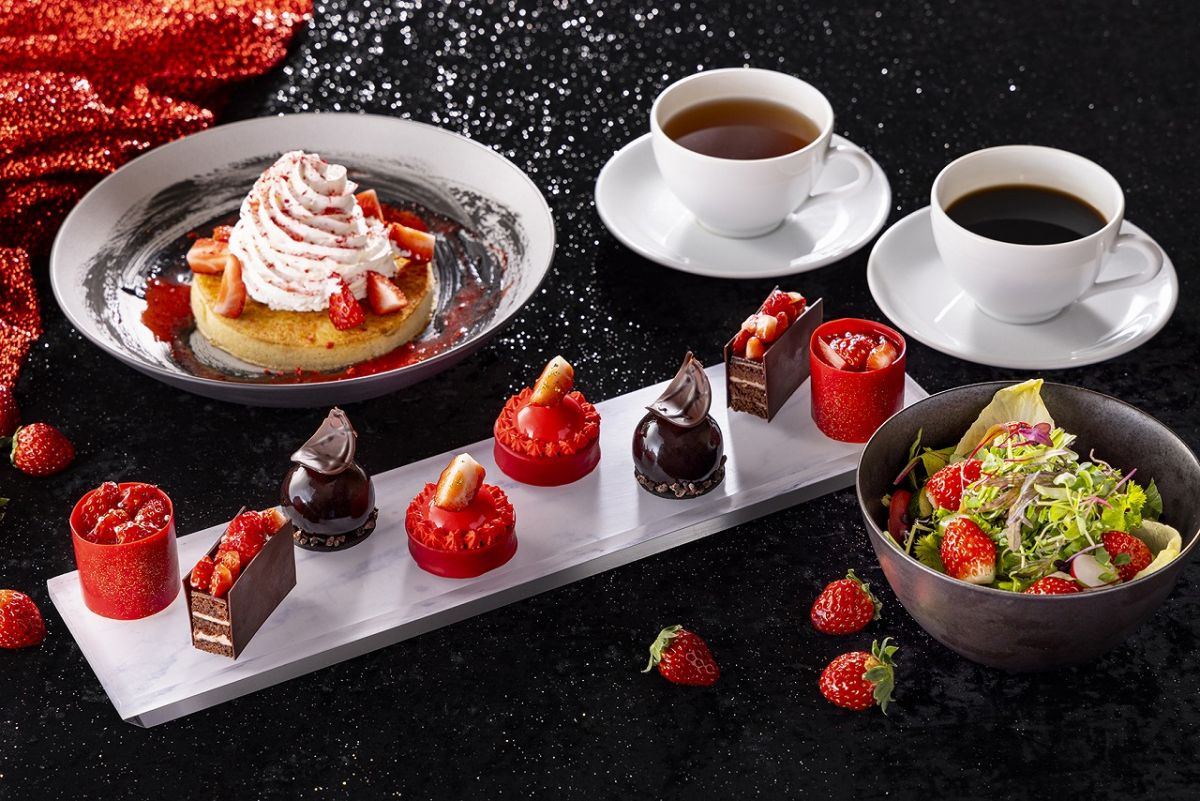 チキンや魚のグリルなど5種から選べるメインディッシュ、イチゴを使ったサラダ、スイーツ5種に加え、フレッシュイチゴのチョコレートディップ、焼きたてミニマドレーヌ、ストロベリードリンクがセットに。イチゴとショコラの魅力を最大限に楽しめる、プレミアムなアフタヌーンティーセットです。