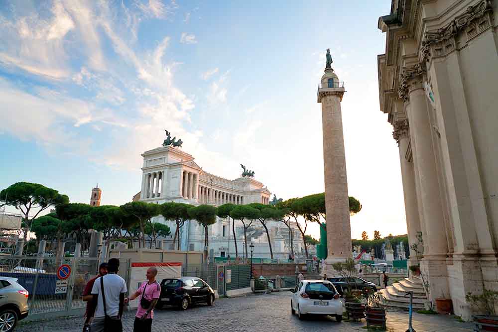 トラヤヌスの市場の前にそびえ立つトラヤヌスの記念柱。トラヤヌス帝がダキア戦争での勝利を記念した際に建設されたモニュメントです。