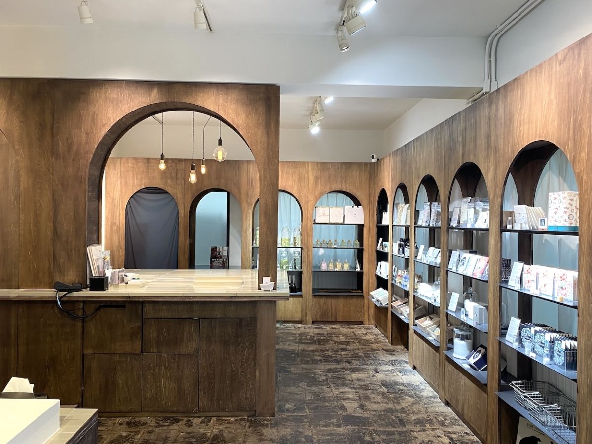 ガラス戸を開けると、落ち着きを誘う香りがふわりと体を包み込みます。店内はアーチ構造がおしゃれな空間。棚にはバスソルトをはじめ、ボディソープやアロマディフューザーなど、40種類以上のリラックスアイテムが並びます。