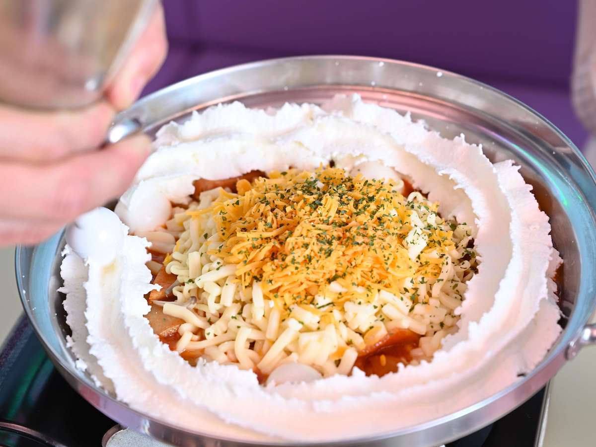生クリームの下に隠れているのは、韓国の屋台で人気のB級グルメ「ラッポギ」です。韓国風のちぢれ麺の“ラーメン”と“トッポギ”を組み合わせたもので、鍋の具には韓国のおでんをはじめ、うずらの卵や豚肉、タマネギ、ソーセージ、とろけるチーズなども加わり、とっても具だくさん。