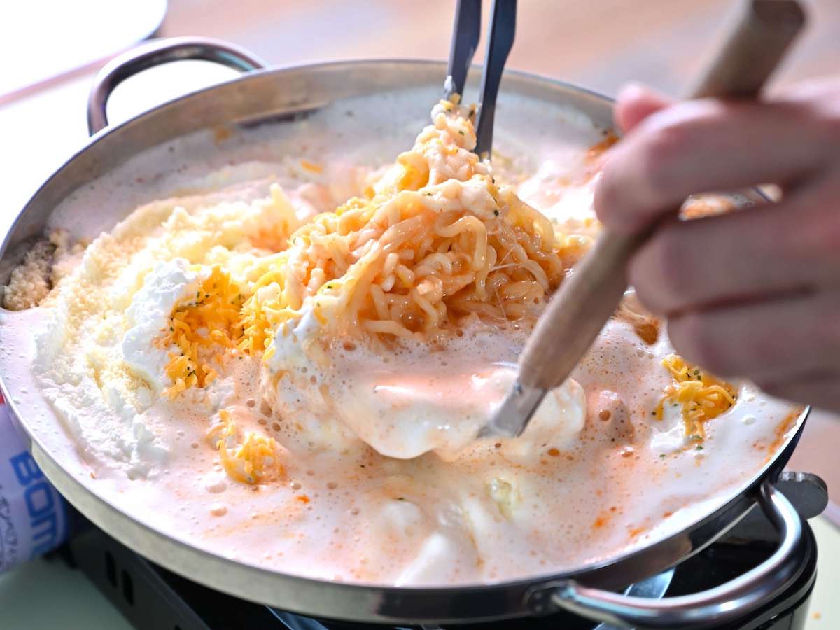 麺がほぐれて生クリームが鍋のスープに溶け始めたら食べ頃です。全体を軽く混ぜて、さっそくいただきましょう!