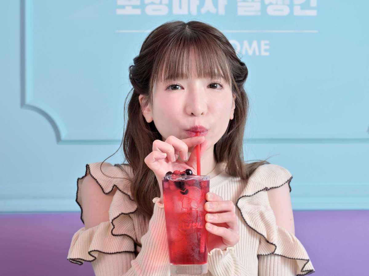 最後はドリンクのご紹介。韓国で人気の焼酎「チャミスル」1078円や「マッコリ」グラス495円などアルコール類ももちろん豊富ですが、私がおすすめするのは100%果実発酵酢を使った、ノンアルコールの「美酢(ミチョ)ソーダ」です。凍結フルーツがゴロゴロ入っているのもおいしさのポイント♪
