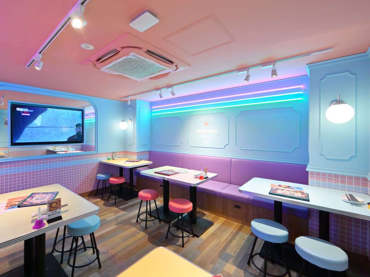 細い通路を進みさらに店内の奥へ向かうと、パステルカラーとネオン装飾のキュートな空間もあります。大型スクリーンに映し出されるK-POPのパフォーマンス映像などを見ながら食事が楽しめますよ。