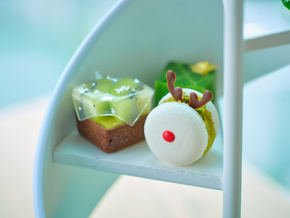 螺旋階段のような白いティースタンドに並ぶのは、抹茶やピスタチオ、カラーチョコレート、キウイを使って、鮮やかなグリーンで統一した繊細なスイーツが6種類。トナカイや柊など、クリスマスを象徴するデコレーションが彩ります。