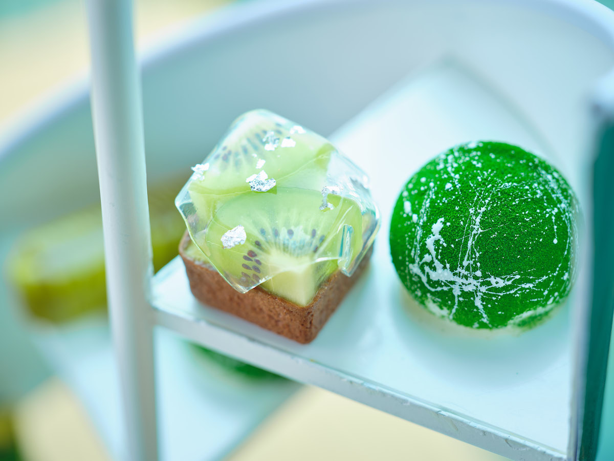 螺旋階段のようなティースタンドに並ぶ、鮮やかなグリーンのスイーツ