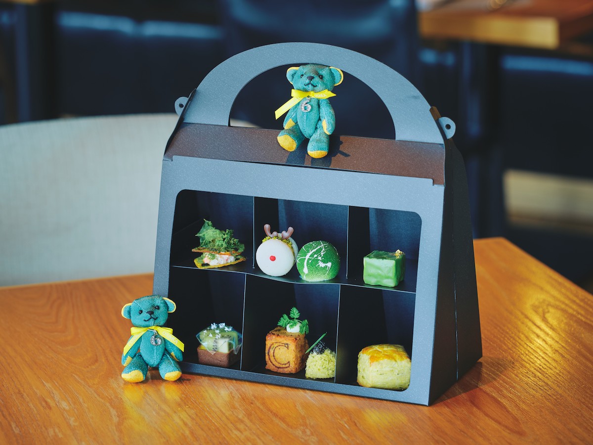 コンラッド大阪オリジナルのファッションバッグのようなボックスに入ったテイクアウトの「MAJESTIC GREEN」ホリデーアフタヌーンティーなら、自宅でも楽しむことできます。