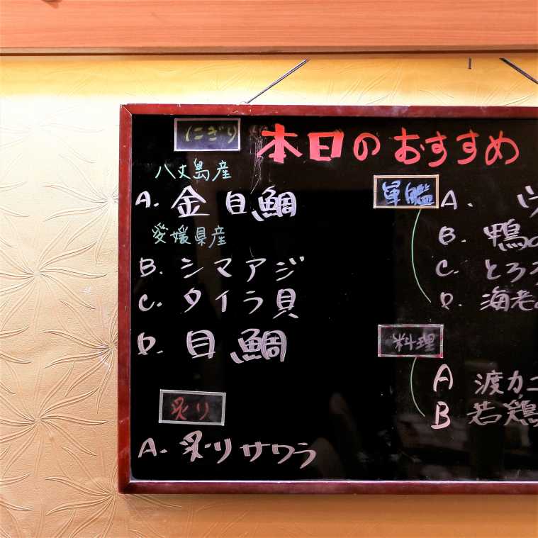 オーダー前にまず見てほしいのが、本日のおすすめが紹介されているボードです。その日イチオシのにぎり、炙り、軍艦、一品料理が約10種類。