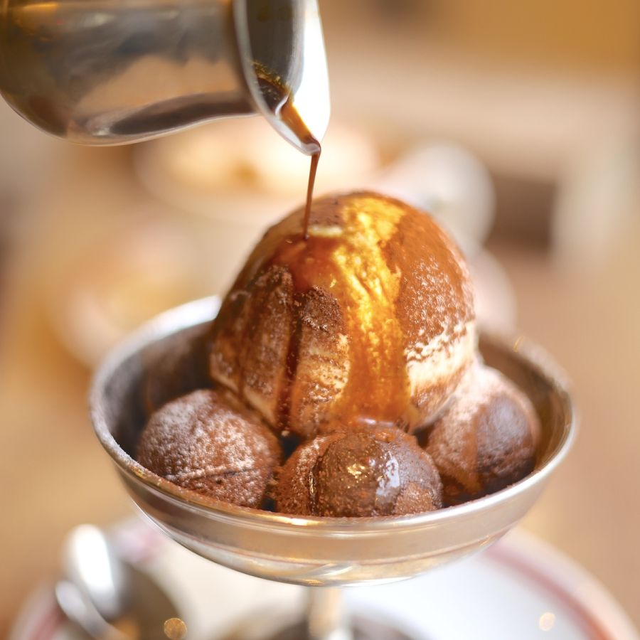 温かいロンシュクレにひんやりとしたバニラのジェラートをどどんとトッピング。