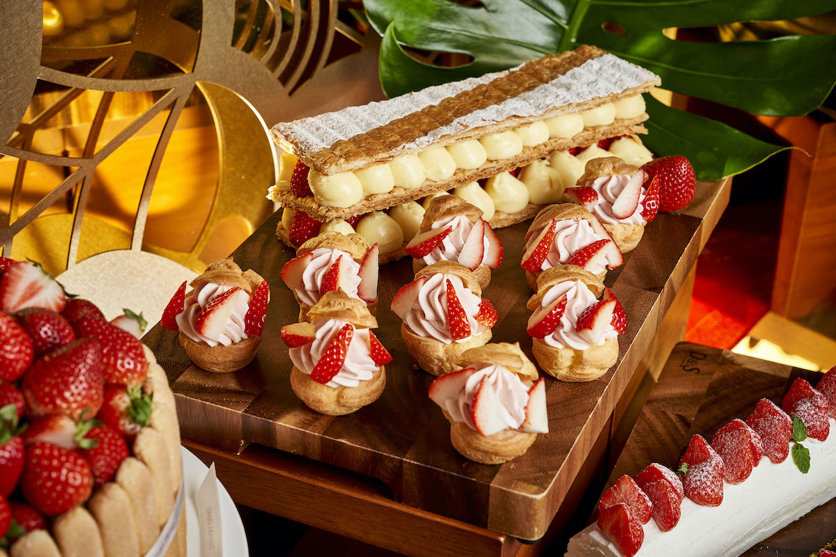 スイーツでは、なめらかな生クリームがイチゴの甘酸っぱさを引き立てる「イチゴのショートケーキ」やイチゴと相性のよいピスタチオがアクセントになった「ピスタチオフィゼ」、「イチゴマカロン」、「いちごシュー」などがビュッフェ台を彩ります。また、イチゴのアレンジを加えたタイの伝統的なスイーツも。「カオニャオマムアンと苺のソース」は、もち米をココナッツミルク甘く煮てマンゴーと合わせたスイーツにイチゴを加えました。ほかにも「ブアロイ」や「ストロベリーケーキ」などがラインアップ。