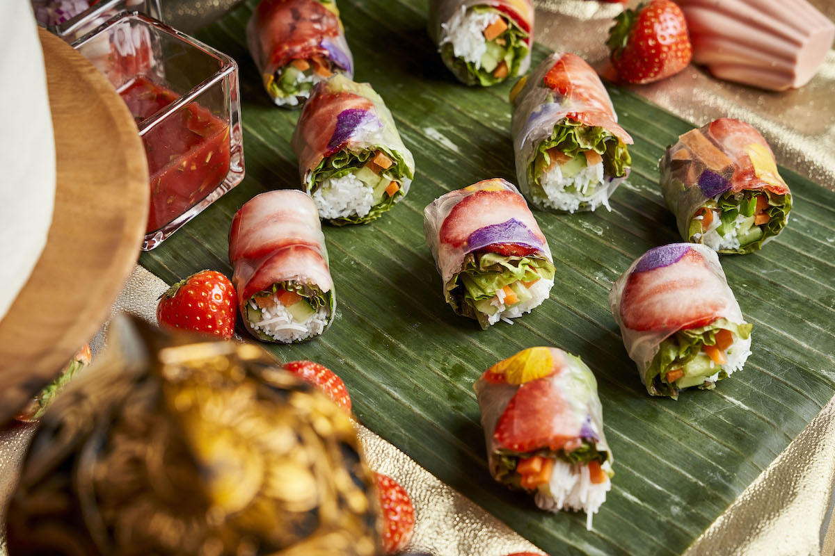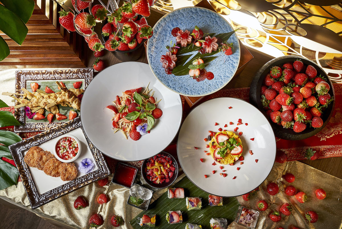 タイ料理レストラン「スアンブア」の料理長ソンポン・アサセット氏が腕をふるうタイの本格的メニューの数々が並びます。イチゴが顔をのぞかせる「生春巻きとストロベリーソース」やタイカレーにイチゴを合わせた「鴨と苺レッドカレー」などのメニューも。