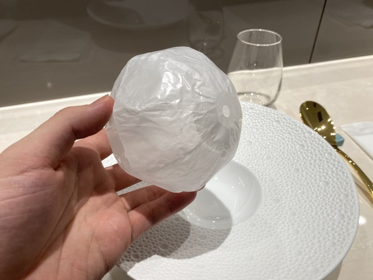 「Glace L’etoile」のコース(5500円)は“アイスのためのコース料理”がコンセプト。まずは、紙風船に香りが閉じ込められた「香りの一皿」でリラックスして準備を整えます。取材時は「ビーツとルバーブ」。柑橘系のようなさっぱりとした香りで心がスッと落ち着きました。