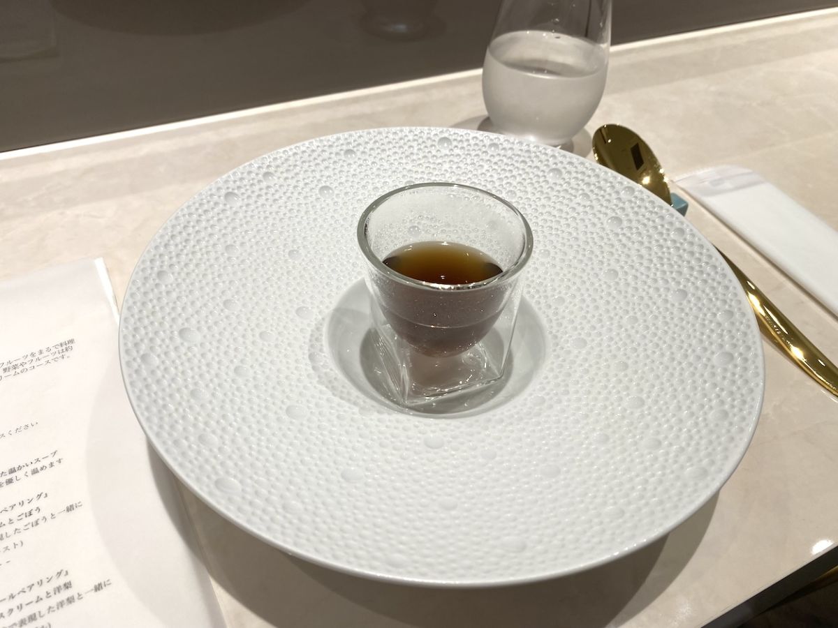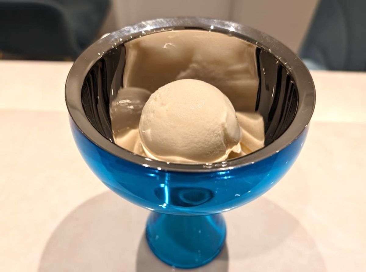 続いては「温かい野菜のコンソメスープ」。塩味を抑えた味わいはシンプルで飲みやすく、身体の内側からジワっと温まります。これは、アイスを食べた時の口溶けを良くするためのひと工夫。“体温が高い時に食べるアイスクリームほどおいしい“という考えからスープを提供しているそうです。