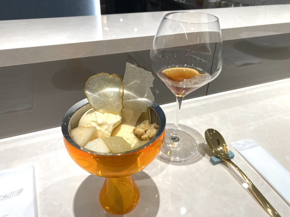 次は「アイスクリームとフルーツ」です。取材時は「マスカルポーネと蒜山ジャージー牛乳のアイスクリームと洋梨」。洋梨のペーストを焼いたチップスと練り込んだクランブル、ラ・フランスを使ったシロップ漬けチップスとコンポート、フレッシュなル・レクチェをトッピングしています。