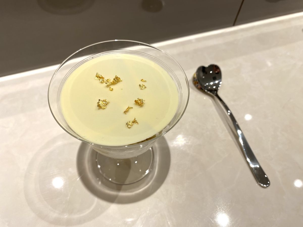 パリパリのチップスとシャキシャキのピクルス、ほってりとしたコンポートの食感が楽しく、ローストではゴボウの香りを強く感じられます。豆乳アイスのさっぱり具合とさまざまな調理法が施されたゴボウの相性が想像以上に良くてびっくりしました!さらに、ペアリングとしてシナモン風味のカモミールティーも。さっぱりした味で次のひと口への準備を整えてくれます。