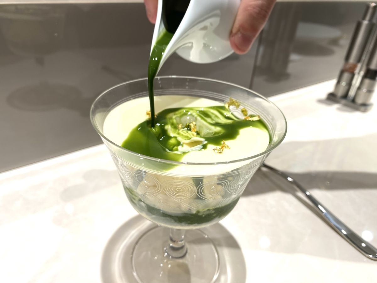 季節のアイスが2つ続いた後に登場したのは、「バニラアイスとホットソース」。こちらは通年味わうことができるメニューです。抹茶とエスプレッソの2種類から選んだホットソースを、目の前でバニラアイスにかけてもらいます。