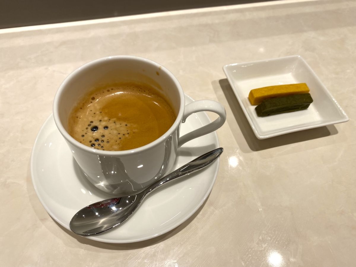 最後は「食後の飲み物」。コーヒーか紅茶を選択可能で、落ちついて食事を終えられます。付け合わせに2種類のクッキーが添えられます。黄色のクッキーはニンジンとハチミツを使用しており、ニンジンの風味がほどよく感じられます。緑色のクッキーにはホウレンソウとチーズを使用。ほのかなチーズの香りが口の中に広がりますよ。