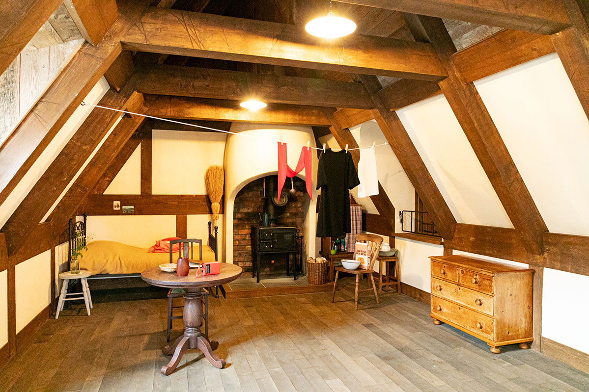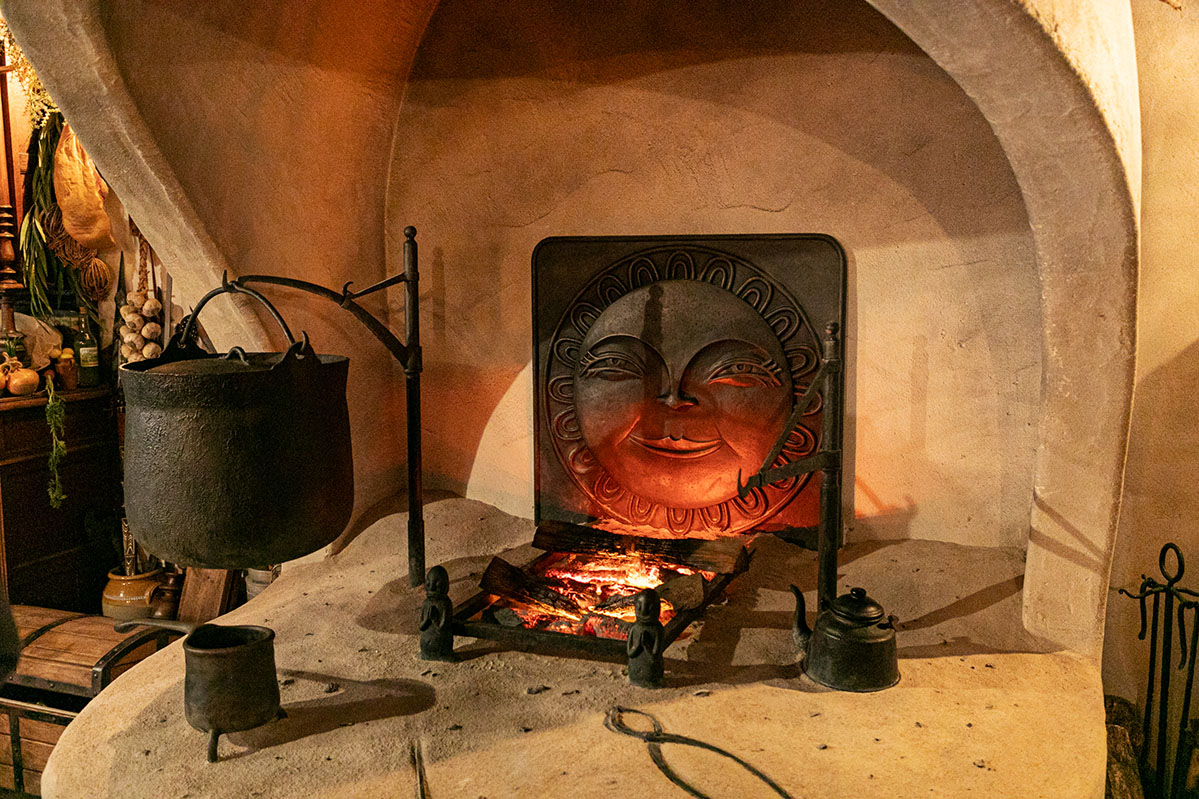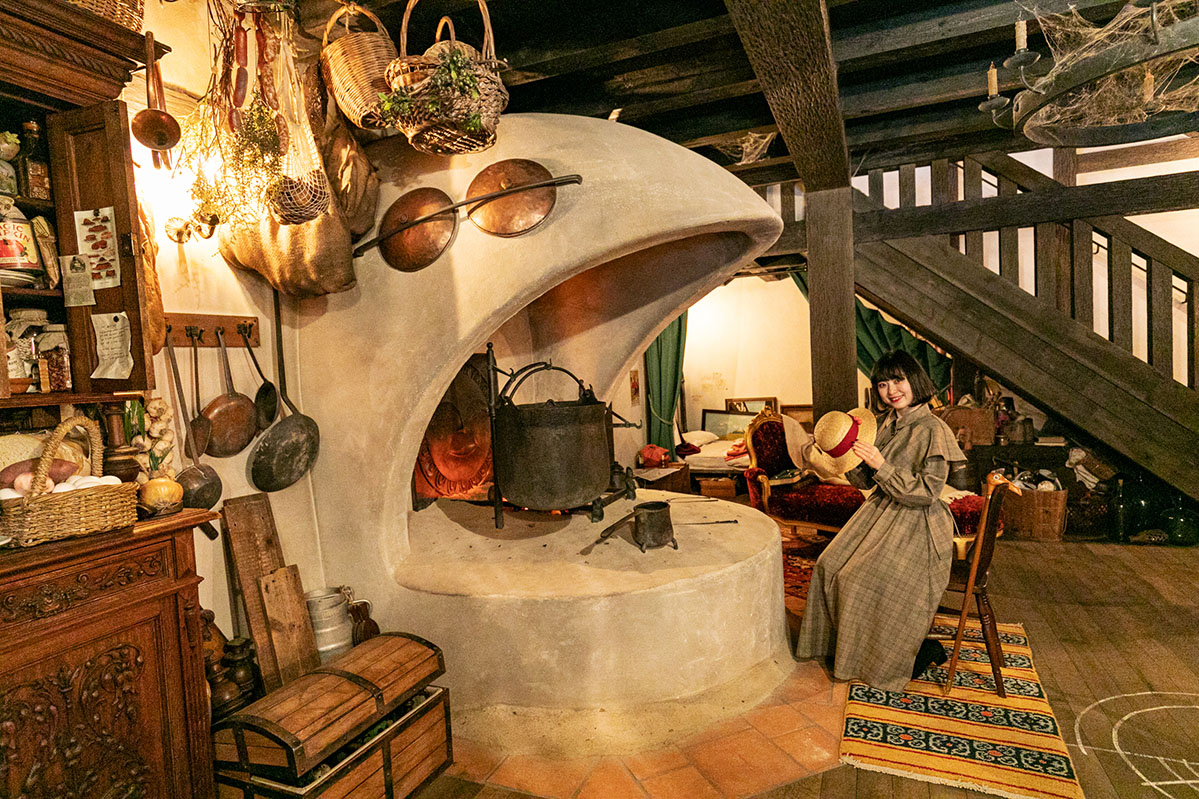 さらに、パン屋さんから裏庭に回ると、キキやジジが寝泊まりした小屋の屋根裏部屋へとつながる階段があり、魔女の修行に励むキキたちの生活を目にできます。