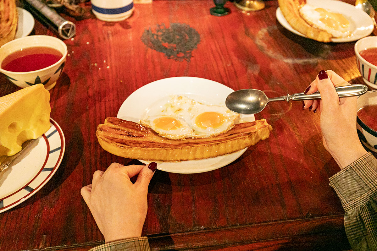 テーブルにあるベーコンと目玉焼きに目がいきますが、よく見ると食べかすまでリアルに再現されているのが驚き。気づきましたか?